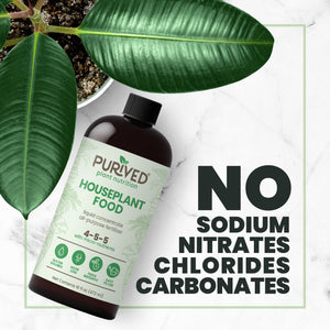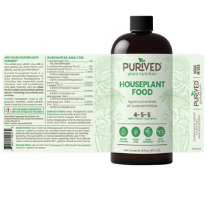 Purived Houseplant Food is a super-concentrated all-purpose liquid plant food that is easy to use and can help maintain greener foliage, beautiful blossoms, stronger stems, and a healthy root system. One 16oz bottle of Purived makes 50 gallons of nutrient-rich liquid houseplant fertilizer. Purived is water-soluble and feeds instantly, providing your plants with a balanced supply of essential nutrients. It has an N-P-K ratio of N4-P5-K5 and is odorless. Purived is suitable for all indoor and outdoor plants, including snake plants, pothos, ZZ plants, aloe vera, monstera deliciosa, bird of paradise, philodendrons, Thai Constellation, peace lilies, rubber trees, Chinese evergreens, ferns, dracaena, fiddle leaf figs, cacti, calatheas, crotons, pilea, jade, African violets, parlor palms, begonias, prayer plant, dieffenbachia, croton, Christmas cacti, and many more.